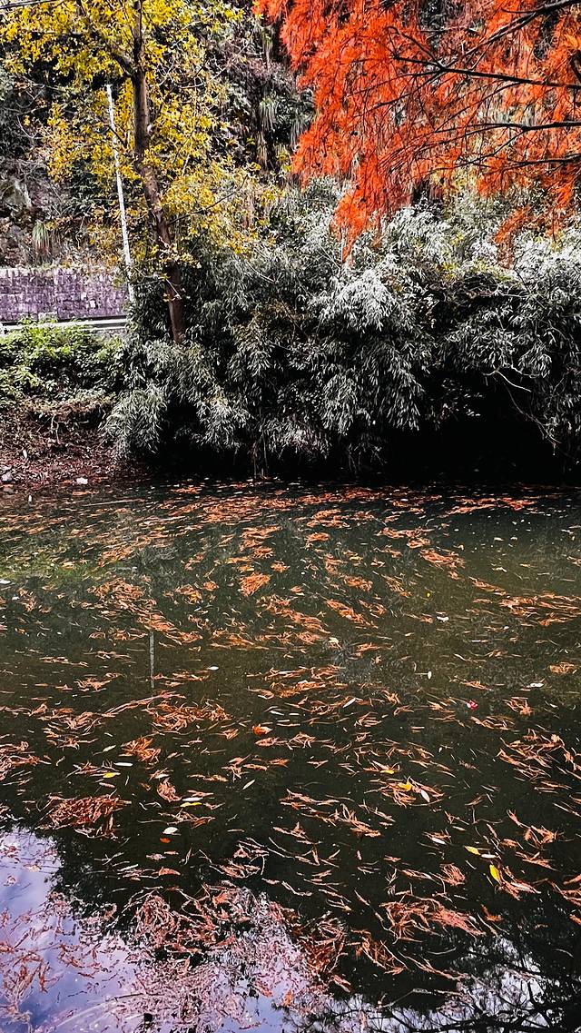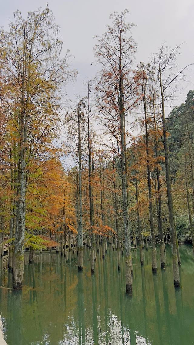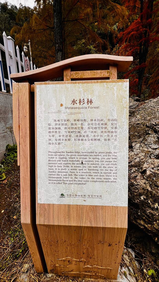 最后一站是雪窦岭。雪窦岭的美景则是另一番风味。沿着蜿蜒的山路前行,两旁的植被繁茂,仿佛置身于仙境之中。山间的溪流潺潺流淌,奏响着大自然的乐章。当抵达山顶,我走进了雪窦岭那片迷人的水杉林。水杉林宛如一幅色彩斑斓的油画。笔直的水杉树高耸入云,在丰水期,它们的根部浸泡在水中,与碧绿的湖水相互辉映。此时正值秋季,水杉的叶子呈现出金黄与橙红交织的绚丽色彩。漫步在林间木栈道上,脚下是松软的落叶,发出沙沙的声响。抬眼望去,阳光穿透枝叶,洒下细碎的光芒,如梦如幻。水面上漂浮着落叶,仿佛是大自然书写的诗篇,让人沉醉其中,忘却了时光的流逝。