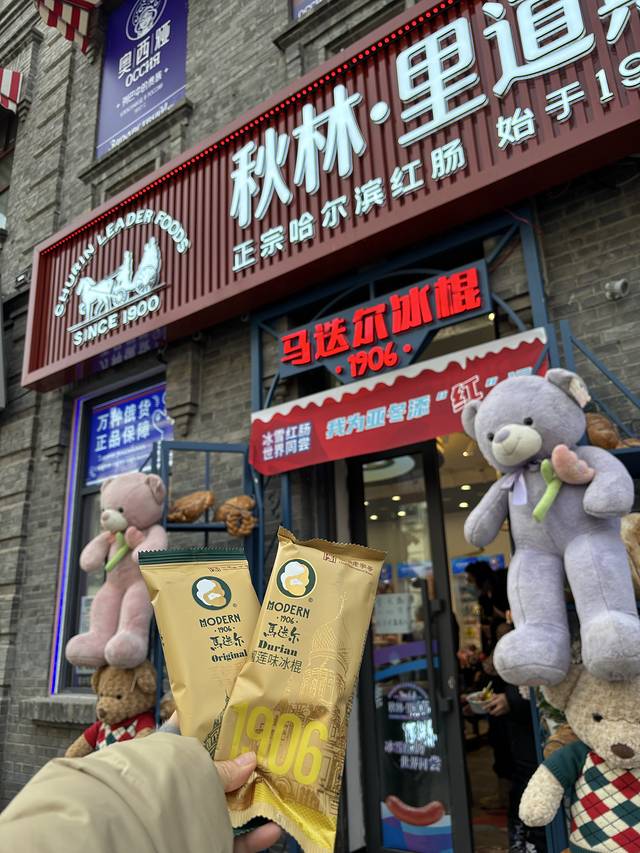 先买了两个马迭尔雪糕一个原味一个榴莲 我喜欢原味的我妈喜欢榴莲味的