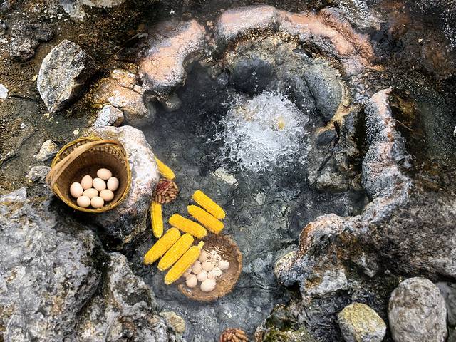 因为地质的原因,景区里还有温泉,烟雾缭绕,别有感觉。不过,二氧化硫的味道确实刺鼻😂😂😂很多当地的工作人员或老百姓就在温泉里煮鸡蛋或玉米,93°的温泉水足以将一切事物煮熟。