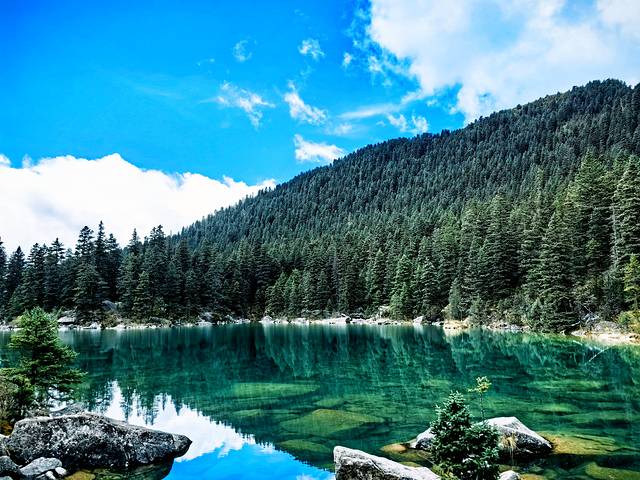 不需要湖泊里有多少鱼🐟🐟🐟,在蓝天白云的照映下,在森林和奇石的衬托下,宁静而湛蓝的海子才是最吸引人的。