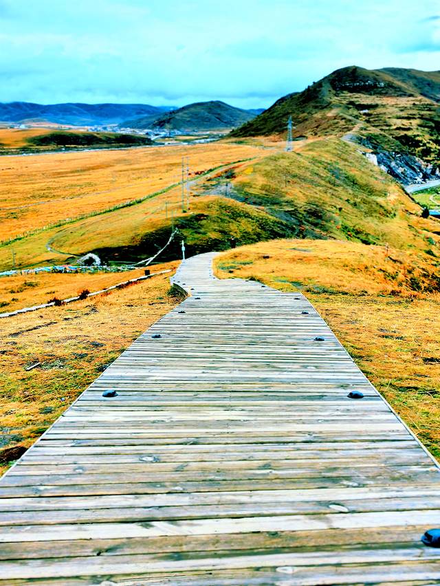 沿着栈道上到观景台,苍茫而辽阔的草原就在你眼前。因为是十月来的,草原已经变成黄色,更增添了几分川西独有的苍凉之感。
