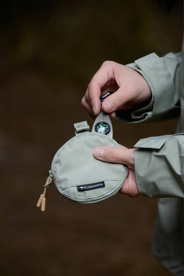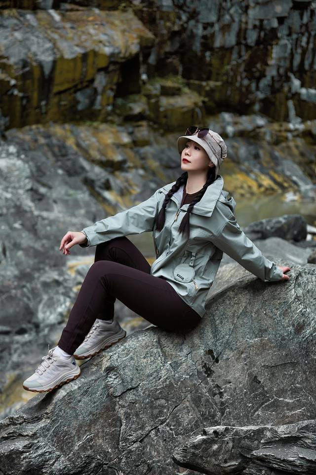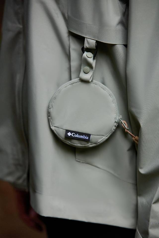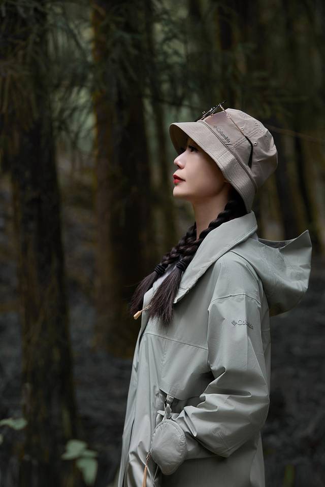 身上的哥伦比亚穿行系列冲锋衣,外置可拆储存袋,随时能拿取小物件,方便实用。