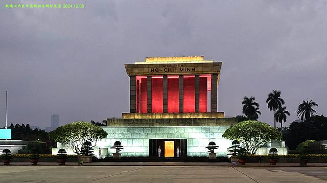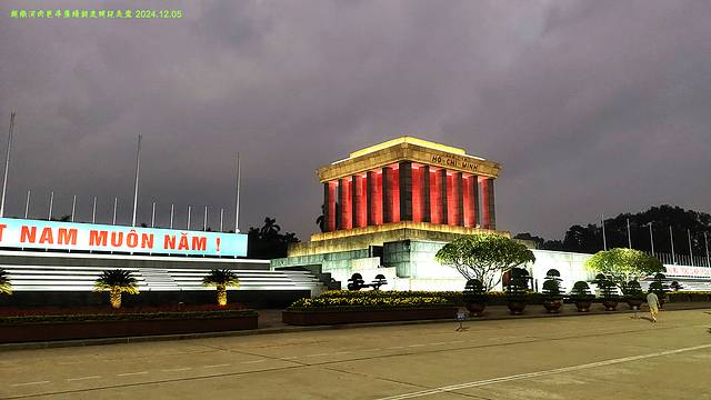 12.06日星期六,早下火车后乘大巴直接去巴亭广场。参观胡志明陵外景(☆☆),观看升旗仪式(☆☆),参观越南主席府(☆)、国会大厦(☆)、胡志明故居(☆)、小木屋(☆)等外景,游览独柱寺(☆☆)。车观国家歌剧院(☆)、中国住越南大使馆(☆)等。