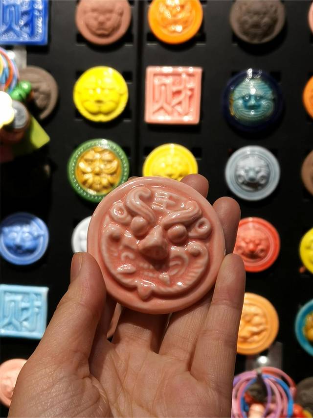 这款瓦当冰箱贴是根据平遥古建筑屋檐上的瓦当描绘制作的,先烧出来再上釉,颜色很多都很漂亮。