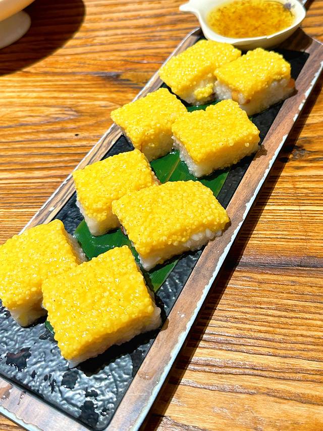 黄米凉糕:上面是金黄的小米,中间夹着葡萄干,下面是一层小米,蘸上清甜的桂花蜜,糯叽叽的超好吃~
