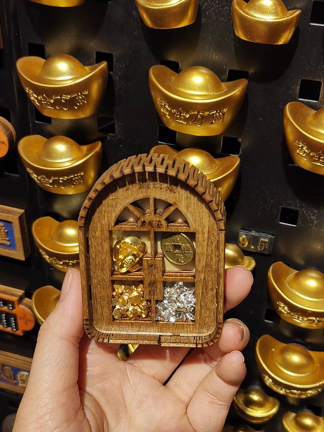 这款冰箱贴的创意来源是协同庆的地下金库,木质榫卯结构的,里面小铜钱的款式年代都不一样。
