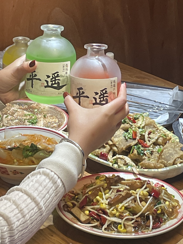 还喝到了当地的平遥果酒,柜子里摆着十几种口味,每一个口味的颜色都不一样,包装很好看,磨砂瓶身上印着平遥两个字,味道也不错,清甜的果香和淡淡的酒香融合,酒精度数也不高,女生也可以浅尝几杯哦。