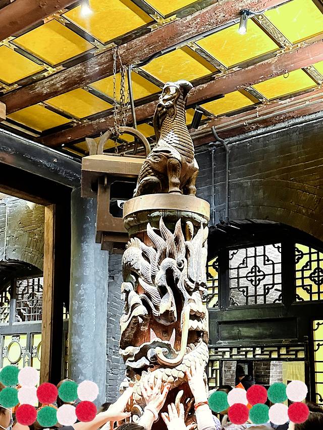 院子下面有平遥蕞大的地下金库,当年储存着数量众多的黄金白银,还放着一根樟木雕刻的神龙宝柱,位于古城的正中心,是平遥古城的镇城之宝。
