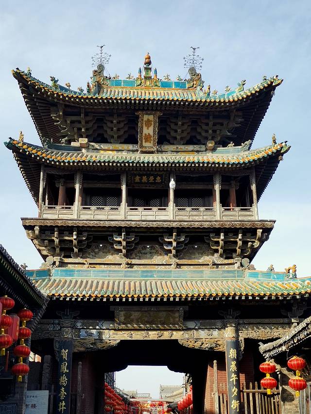 市楼位于古城的中心位置,贯穿南大街南北,是古城内唯一的阁楼式高层建筑,风格别具特色,是研究平遥城市发展史、建筑史的重要实物。屋顶的南北两面,分别用黄蓝亮色的琉璃瓦镶嵌出南“囍”和北“寿”的文字图案,更赋予市楼深刻的文化内涵。