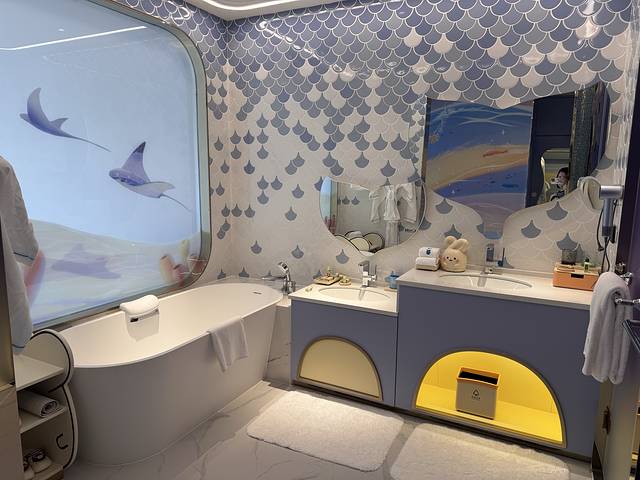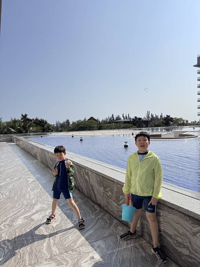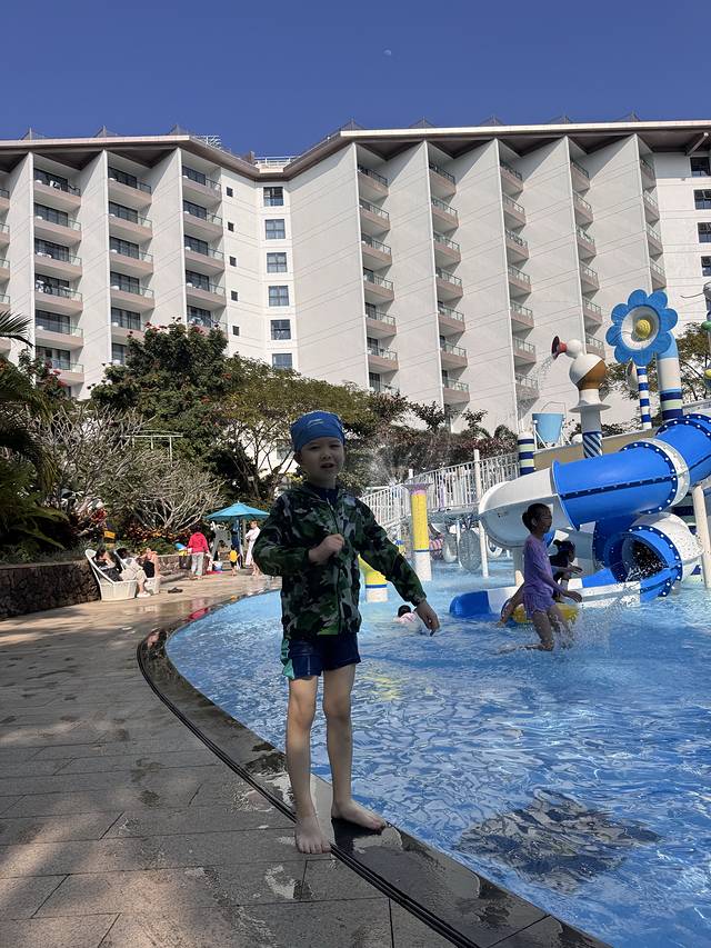 今天要住此行最期待的酒店啦—海南三正月酒店,是1月份新开的酒店,据说是亲子酒店的天花板,本来预定的是豪华园景房,酒店给升级了比心兔亲子房,孩子们高兴疯了~不过,客观来说,酒店刚刚开业,园林和绿化都有待完善,海边的沙滩有一个很高的的落差,而且海浪特别高,也不能下水,但是海边一片椰林,拍照还是挺出片的,酒店还有恒温泳池,一楼的儿童乐园不收费,户外的水上乐园因为突然降温我们没玩,总体来讲中规中矩吧~