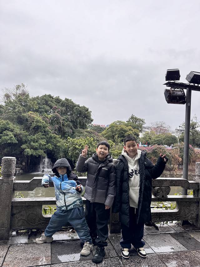 今天不着急赶路,睡到快八点才起床,去楼下吃了酒店的早餐,我们就收拾行李出发去象鼻山景区转了转,今天还是阴天且不时的飘点小雨滴,但都到了桂林,到了这个甲天下的地方,不转一转岂不是白路过了么。不过导航看了一下,快到象鼻山附近堵的都发紫了,1.5公里的路显示需要半个小时才能到达,我们决定两位司机在车上等待,我们三位女士带着六个孩子步行到景区,路上好多人都是步行前往,下过雨的街道,空气特别的清新,我们一路走一路拍,一路吃,游玩了大概两个小时,又走回来跟留守的两位汇合,在去高速的路上正好看见路边有一个桂林米粉的小店,今天的午饭那必须得吃点特色了~桂林的粉真是太便宜了,春节期间涨价一元,一碗粉也才五块钱,加了两份肉的炒粉二十元,一行人85块钱就吃的饱饱的了~下午13:00,我们上高速继续出发,今天预计到达湛江。但是计划赶不上变化,路上仍然一直下雨,车很多也跑不起来,虽然才五百多公里的路,但导航预计要晚上八点才能到了,中间小伙伴还走错了路,我翻完导航看酒店,突然发现如果到湛江下边的小县城遂溪县可以早到半小时,7:30左右就能到达,明天从遂溪去徐闻港也比从湛江走距离更近时间更短!立刻定了遂溪县晴天假日公寓(全丰广场店),308/晚双床带早餐,晚上在酒店附近吃了广东特色烤牛肉和牛杂煲,小县城的年味特别浓烈,放炮声此起彼伏,真是丰富的一天~