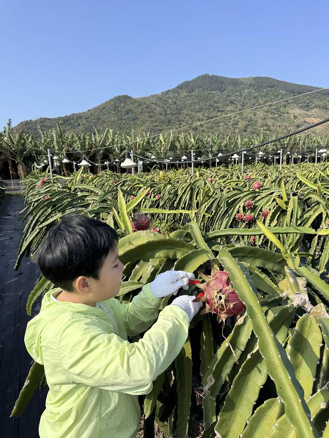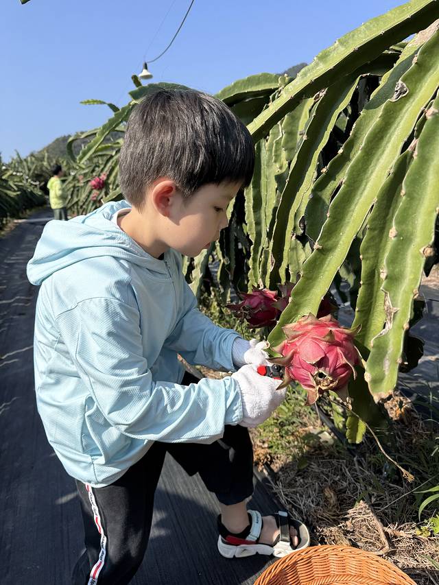 今天上午我们的安排就是去采摘~想要带孩子们了解一下热带植物都是怎样成长的~先去了一个离酒店不远的火龙果采摘园,19元/人的门票送2斤,然后采摘的果好像是6元/斤,到了基地老板就先给切了两大盘,跟我们说免费吃管够~吃完我们就进入果园开始采摘,火龙果长在根仙人掌一样的植物上,需要小心的用剪刀剪下来,我们一共摘了三个大的两个小的算上两个人的门票一共花了68块钱。这个火龙果基地旁边都是香蕉树,没有其他水果,我们又开车到了另外一个采摘园,看见了百香果,杨桃树,园子里还养着鸡鸭,孩子们像是到了小农场一样,玩儿疯了……然后我们就开车去了此行第一个五星酒店陵水威珀斯度假酒店办理入住,在这里我们要住两天,不幸是这一行人算上我三个大人都从今天开始发烧腹泻,他们的症状比我轻一点,我烧到38.7度,进到房间我就躺到床上蒙着被子开始睡,一直到两天后的上午退房才恢复……