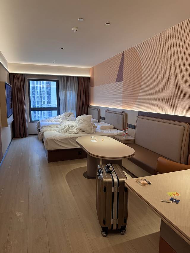 今天还要继续赶路,不知道是因为太兴奋还是怎么,我几乎一晚上都没睡好觉,6:58分我就在群里呼叫小伙伴儿们起床,7:30我们准时退房给车加油出发了,因为今天才大年初三,酒店附近的早餐店也没开业,我们就一致决定到高速上吃去吧!今天目的地是广西桂林,大概800公里,预计八个半小时到达,但是出发的时候荆门就开始下小雨,然后这一路从湖北到湖南到广西一直在下雨,路上还有几次小拥堵,导致我们并没有比昨天早到目的地,还是晚上7:30左右到达酒店,今天住的是桂林城市便捷酒店(飞虎公园店),在去哪儿网看好后直接给酒店打电话预订的,258元/间双床房,还送了早餐,房间中规中矩吧,但拉开窗帘就能看见桂林独特的山,还是不错的~今天司机们开得都有点累,就没有出门吃饭,各自在房间点了外卖吃了。