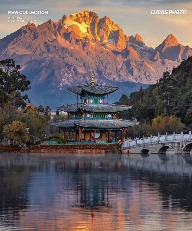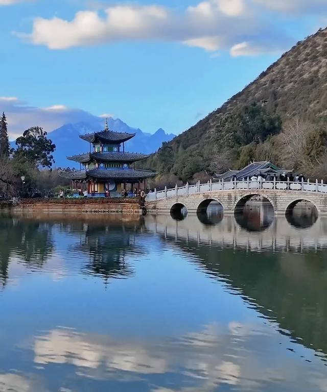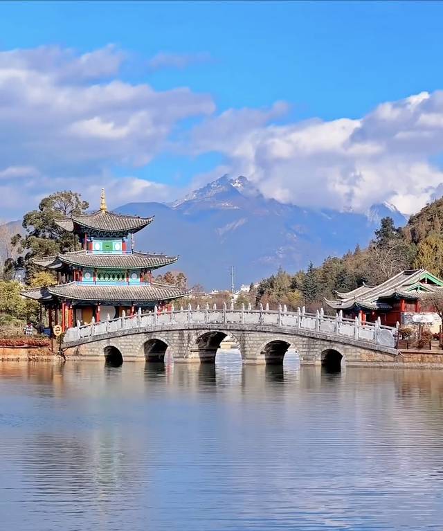 沿途走向南门,会经过五孔桥,可以拍和雪山同框