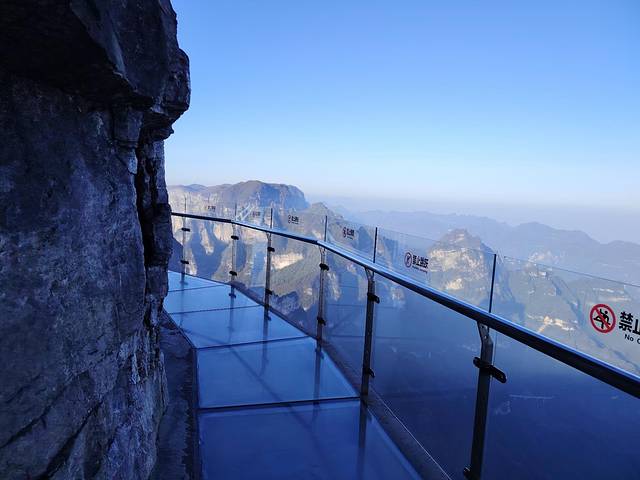 早餐后乘车前往张家界大峡谷云天渡玻璃桥景区,景区位于中国湖南省张家界市慈利县三官寺乡,毗邻世界自然遗产武陵源,集俊峰幽谷、山岩奇洞、涧泉湖泊于一体,被誉为“张家界地貌的博物馆”。壮丽的悬崖绝壁景观,如诗如梦的峡谷风光,举世闻名的人行玻璃桥,丰厚多样的人文历史,惊心动魄的极限体验。大峡谷云天渡玻璃桥是一座景观桥梁,兼具景区行人通行、游览、蹦极、溜索、T台等功能。 主跨430米,一跨过峡谷,桥面长375米,宽6米,由99块透明玻璃桥铺就而成,桥面大小总共124块透明玻璃桥,距谷底相对高度约300米。为斜拉式高山峡谷玻璃桥,其长度、高度位居世界前列,并创下多项桥梁建筑之最。