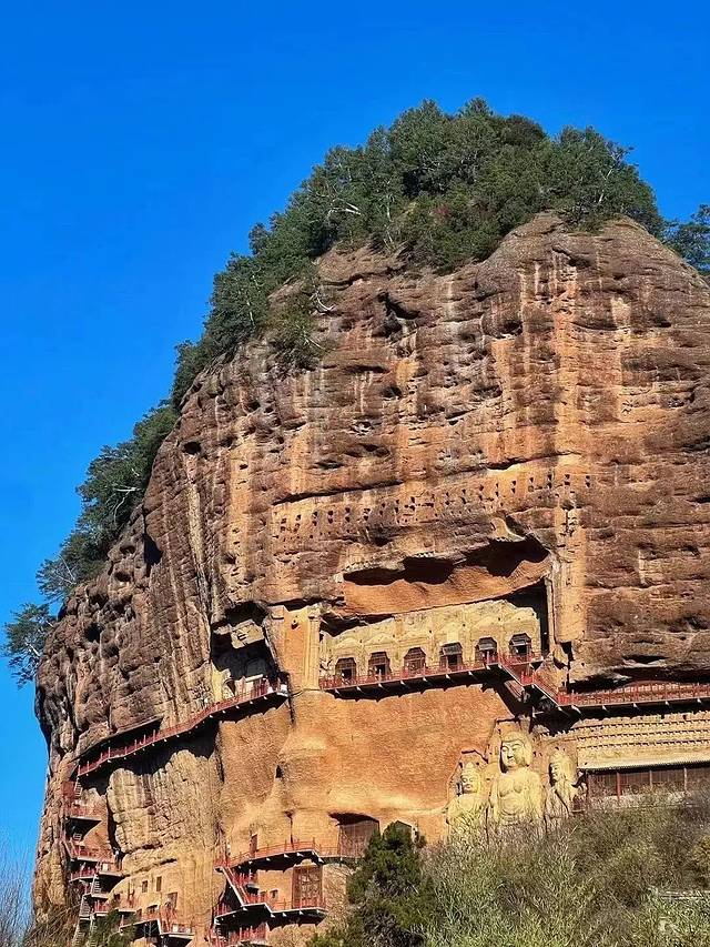 这里是麦积山石窟,是中国四大石窟之一。如果说,敦煌莫高窟是戈壁中的“大画廊”,那麦积山石窟则是崖壁上的“雕塑馆”。