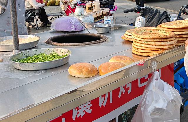 回来时在路边看到一个卖烤馕的小摊,摊主是一个新疆人,他戴着一顶小白帽,手上和脸上沾满了面粉。他把面团在一个特制的圆木板上压成圆饼,然后粘上芝麻、葱花和椰肉碎屑,最后贴到炉子里烤。这个味道太香了,我闻到了家乡烧饼的味道,我给他扫了五元钱,让他把一个刚出炉的馕给我装到塑料袋里。