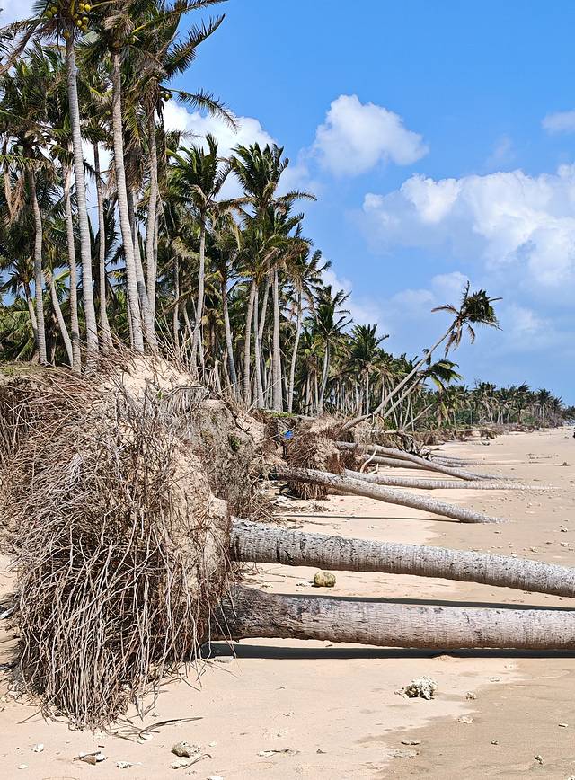 这是一带狭长的沙滩,沙滩向外伸到大海里,向内伸到椰林里。树林边上的这些椰树离大海是如此的近,以至于涨潮时海水会冲刷到它们的树根。我以前没有见过椰树的树根,可是眼前这些椰树的树根都已经被海水冲刷得暴露在外面,我可以近距离的仔细打量它们。椰树的树根就像是浓密粗壮的胡须一样长在树干的根部,每棵树都有成百上千条须根,每条须根都有吸管般粗细,长度大多在十到五十厘米之间。不像其他树种那样有着又粗又长的树根,可以牢牢地伸向泥土深处,椰树只有这种又细又短须根,这种须根伸到土里的深度也只有四五十厘米,所以在松软的沙滩上椰树站的并不劳稳。我看到一排椰树躺倒在沙滩上,树干埋没在沙子之中,它们根部的沙子已经被海水掏空,浓密的根须全部暴露在外,就像一个个干柴堆。我在河南河北的农村经常见到堆在墙根上柴火垛,一棵椰树的须根堆起来也应该会是一个不小的柴火垛,足够一个家庭几天烧火做饭之用。看到椰树的树根我会立即联想到喝椰汁的吸管,想必这些须根一定很容易吸收水分,所以树上才会结出那么多椰子,每个椰子里面才会又那么多甜美的椰汁。