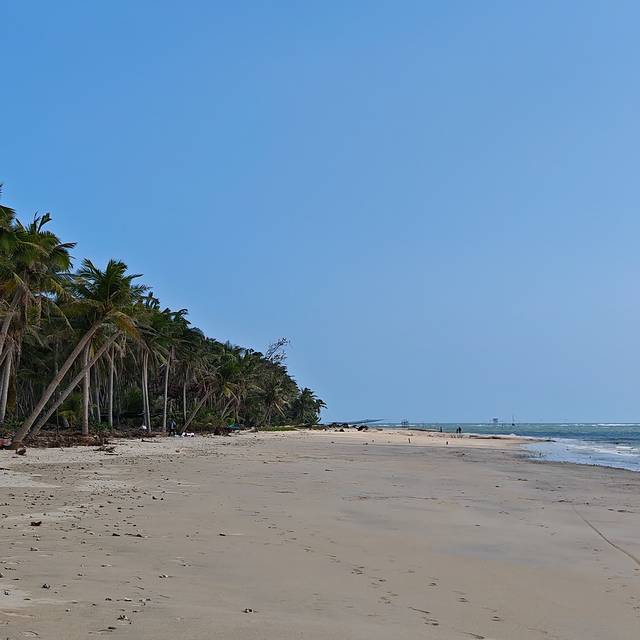走了好大一会儿,我看到路边有一条宽阔的沙土路通向椰林里,林子里有一个茅草棚,棚下有人在卖椰子。草棚前面的树下放着几张桌子,有几个游人正坐在桌子旁乘凉、喝椰子,他们的小汽车也在椰树下停着。我并没有停下来休息,而是顺着路穿过椰林,一直走到海边,原来这片椰林是紧靠着大海的。