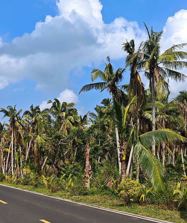 今天的天气很棒,头顶是大片的蓝天和白云,深绿色的椰林在这样的天气里看着很有感觉。我沿着公路旁的草地边走边看,并用手机不停地拍照记录。两旁的椰树林很稠密,除了树下有一种长着大圆叶的低矮植物外,树林里没有一棵杂树。这里的椰树比别处的椰树更高更粗壮些,也可能是树龄较大的原因。树林里的椰树并不都是直直的站立着,有不少椰树都是斜着身子站在那里,还有一些扑倒在别的椰树上,或是干脆躺倒在地上。椰树的叶子也没有城市或小区里那些椰树的茂盛,靠下的几片叶子往往干枯地垂在树上,还有的树上叶子很少,就是那么一小撮的几片叶子顶在树顶,使得整个椰树看起来又高又光溜。椰林的这种形态应该是与台风作斗争的结果,一场场台风刮过,一阵阵暴雨下过,再坚强的叶子也会被打折,再坚挺的树干也会被吹歪。但是不管是直的椰树,斜的椰树,或是扑倒在别的树上的椰树,只要不倒在地上,树顶上都会挂着大大小小的椰子。