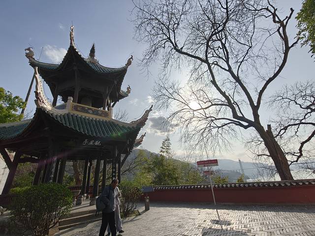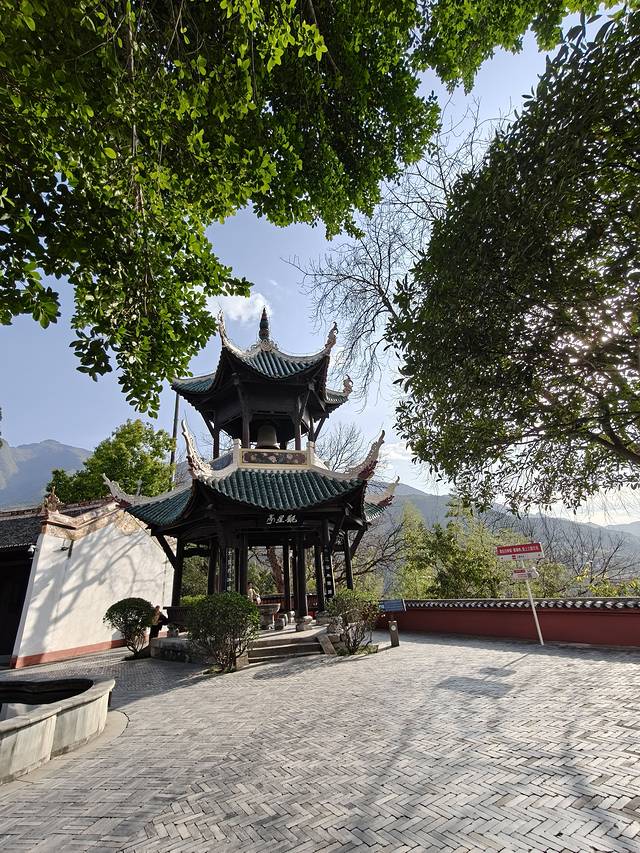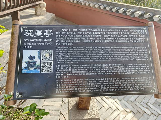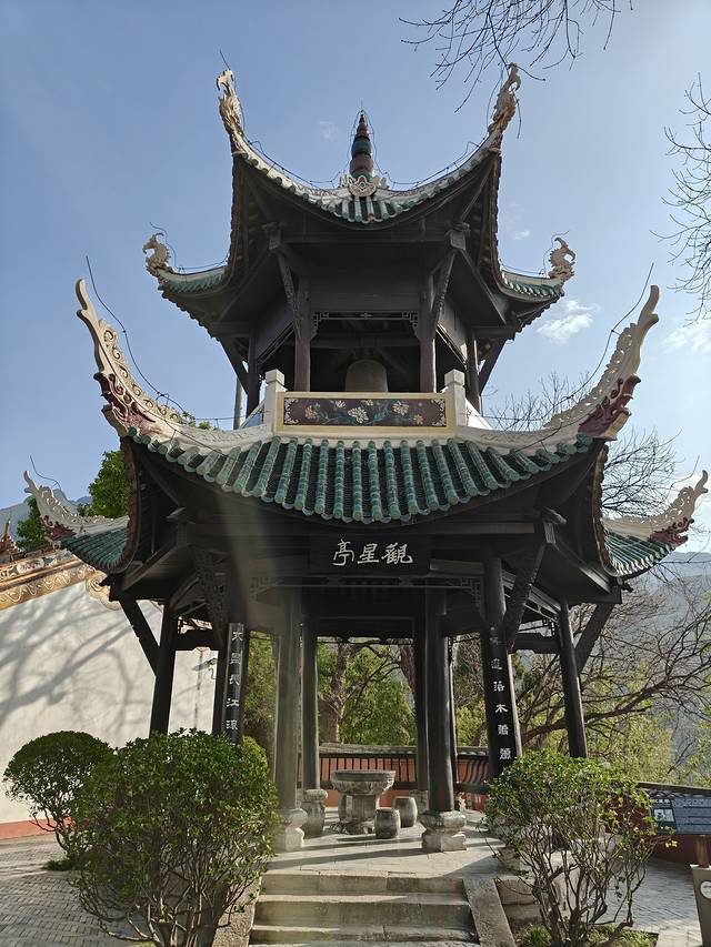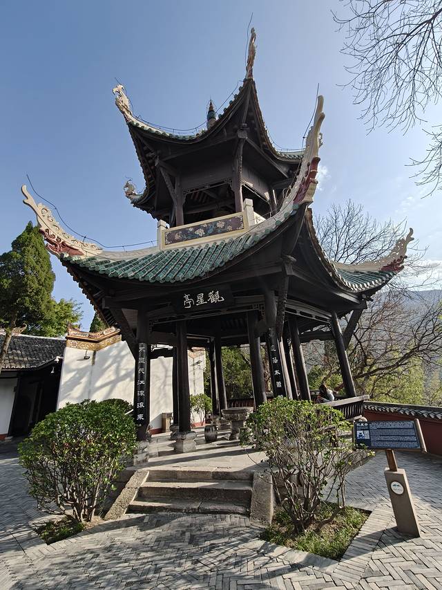 观星亭位于托孤堂西侧,为六角重檐亭。底层由12根木柱、上层由6根木柱支撑,飞檐翘角,造型考究,亭中有一古钟高悬。传说诸葛亮率军入川时,曾在此夜观星象,故名“观星亭”。