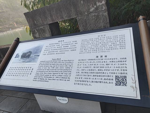 滟滪堆原是横亘在瞿塘峡口、白帝山下的一座巨礁。长30米、宽20米、高40米,逆江而立,犹如一只凶猛的拦路虎,横截半个航道,自古以来撞沉无数船只。“滟滪回澜”以狂澜万卷、泡漩千重闻名遐迩。光绪《奉节县志·山川》载:“滟滪堆,屹立瞿塘峡口,中流之巨石也。邑人自古相传:滟滪堆下面有夔龙,夏天水涨,龙从西瀼河(今梅溪河)潜入龙潭沱,伏于龙王庙下;秋天水涸,又回滟滪。”如遇久旱水枯,滟滪可露大半,其下有三足如鼎,滟滪堆虽有覆舟危险的一面,但也有导航安全的一面。1959年冬,整治川江航道时,滟滪堆被炸掉。从此,瞿塘峡口变“天下至险”为“高峡平湖”。唐宋多位诗人以“滟滪堆”为名为题咏叹。