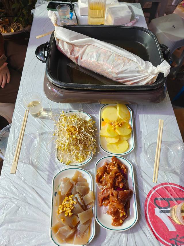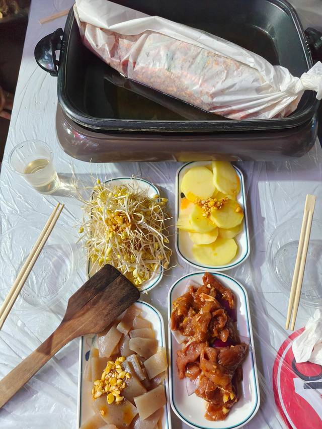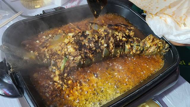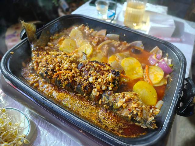 蒜香微辣的纸包鱼,巫山特色菜。好吃!对面就是巫山江边的夜市,新年很多人在放烟火,很热闹。一边吃饭一边可以看烟花!