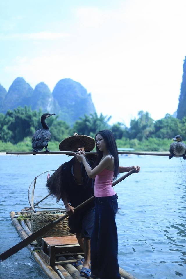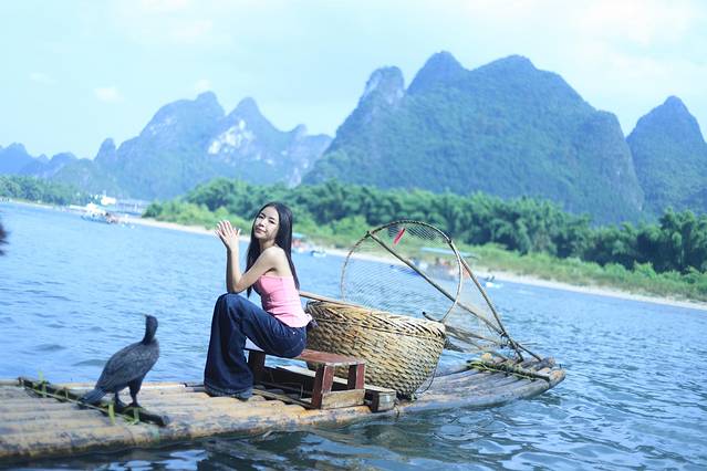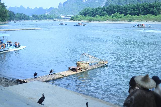 很多老人在漓江边上放了鸬鹚和竹筏 合照要收费10元,