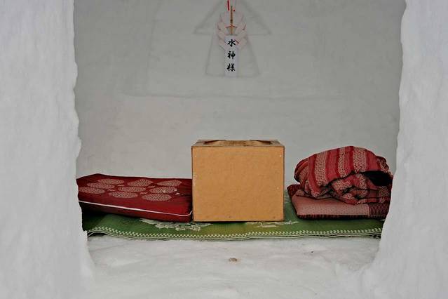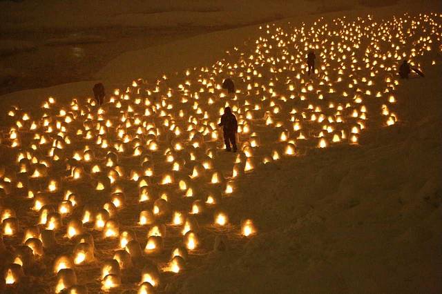 大的“雪窑洞”内会有当地的小朋友穿着 日本 冬季的传统居家服--半缠,为来客奉上热茶和点心。夜晚来临也会点灯,星星点点的火光摇曳在冰雪之中,十分梦幻。如图。