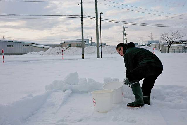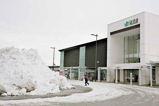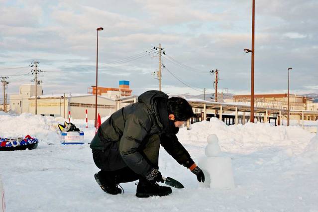 小伙伴给安排了一个制作”迷你雪窑洞“的体验,就在车站旁边。负责人大哥和一个姐姐已经等在了雪地里。只见横手站的一面站外空地没有除雪。厚厚的积雪被堆成了一个节日期间同款的”雪窑洞“。周围还有几处小型滑道。