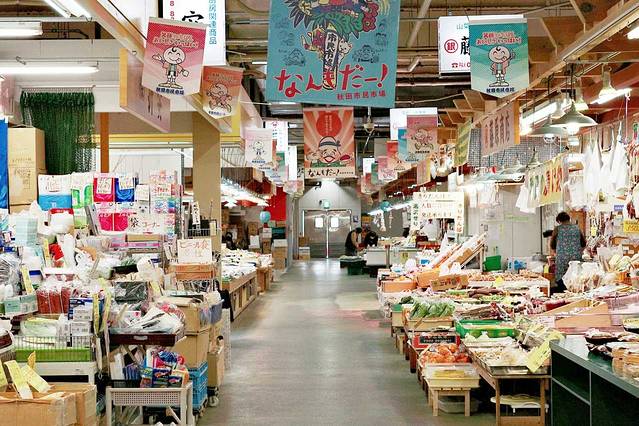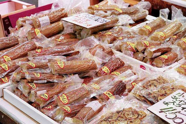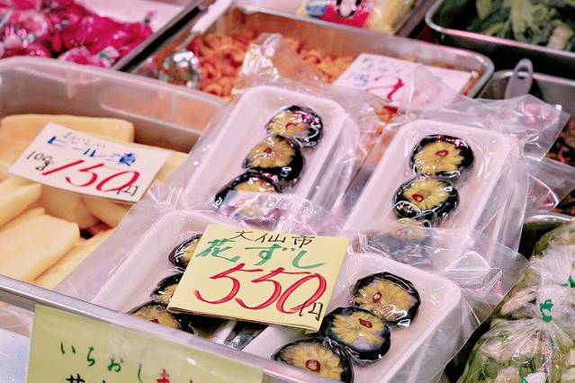 菜场氛围很亲民。除了一些叫不上名的秋田产蔬菜,还有当地特色的”花寿司“(大仙市特产),”烟熏萝卜“等出售。