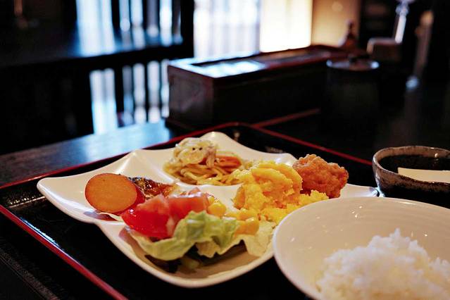 这家的早餐是在旁边的"唐桥茶屋“用的自助餐。坐在传统榻榻米坐席上的话,可以直接眺望着清晨雪中的JR秋田站用餐。