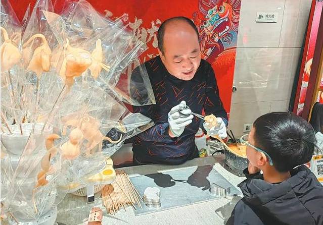 除了静态的展品,馆内还设有表演区域。正巧赶上吹糖人,我麻溜地就凑了过去。只见一位老师傅,面前摆着一锅冒着热气、金黄透亮的麦芽糖稀。他先揪下一团糖稀,在手里快速揉了揉,那手法,娴熟得我眼睛都不敢眨。紧接着,老师傅把糖稀搓成条,一头捏出个小尖,放在嘴边轻轻吹气。神奇的事情发生了,那团糖稀就像被施了魔法一样,慢慢地鼓了起来,一点点变成了一个葫芦的形状。还没完呢,他又这儿捏捏、那儿按按,不一会儿,一只活灵活现的小老鼠趴在葫芦上的造型就出现了,我直接被这操作惊掉下巴。