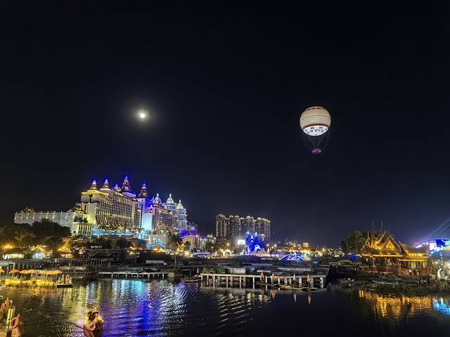 这个照片元素挺多的,正月十五的月亮,升在半空中的氦气球,江水,灯光。