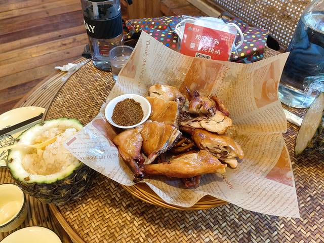 曼飞龙烤鸡和菠萝饭烤鸡刚吃的第一口还是挺好吃的,外边儿酥脆,里边鲜嫩。菠萝饭甜甜的也还可以,就是人流量不大,就是不排队的餐厅,吃着有点没底气。按理说那天是正月十五,还没有过春节的旺季。两个人100多块钱,倒也不贵。不过,星光夜市附近也有个曼飞龙烤鸡的分店,那个可以在江边吃,景色更好。等知道时,已经吃过了?
