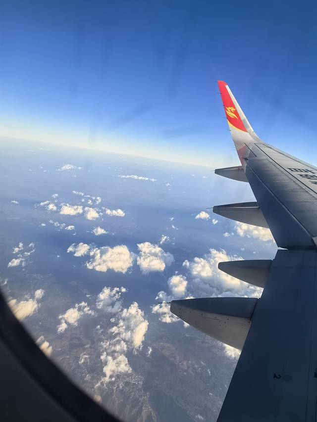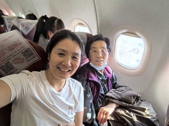 我妈上次去桂林坐过飞机,没那么新鲜,但我们还是自拍了机上的合影。让她挨着窗户坐,也可以多看看外边的云彩。位置选择稍有失误,老有个大翅膀相随。