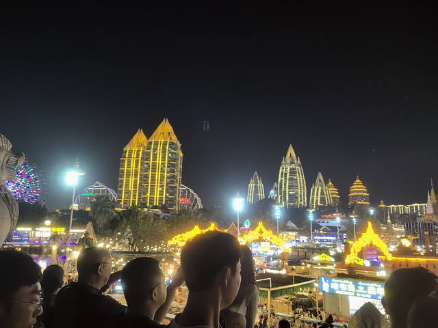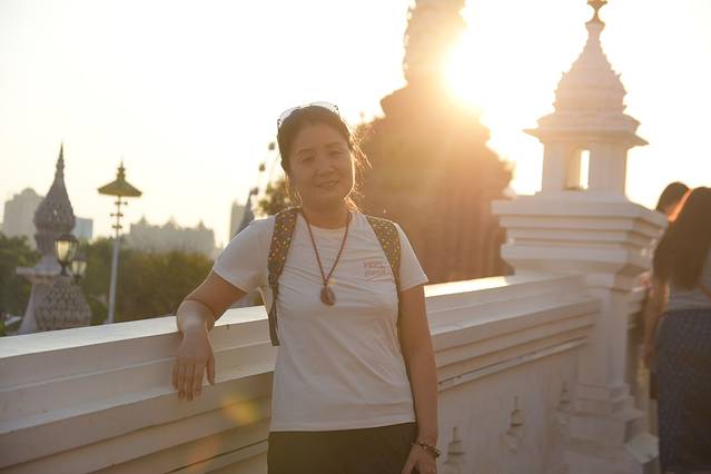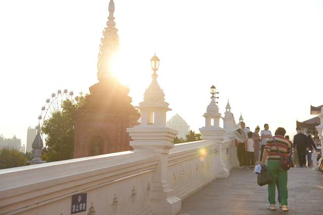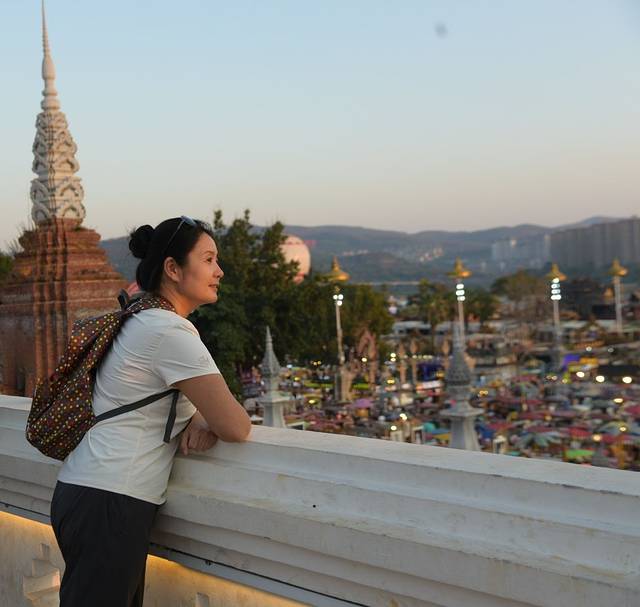 身后是大金塔,面前是星光夜市,号称亚洲最大的夜市,当时在等待天黑亮灯。光线很柔和。
