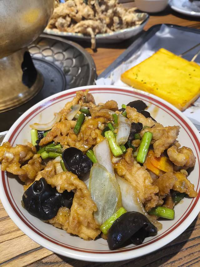 过油肉是 山西 的传统名菜,在 平遥 也能品尝到地道的味道。它以精选的猪肉为主料,搭配木耳、蒜薹等食材,经过上浆、滑油、炒制等多道工序制作而成。成菜色泽金黄鲜艳,味道咸鲜闻有醋意,质感外软里嫩,汁芡适量透明,十分美味。