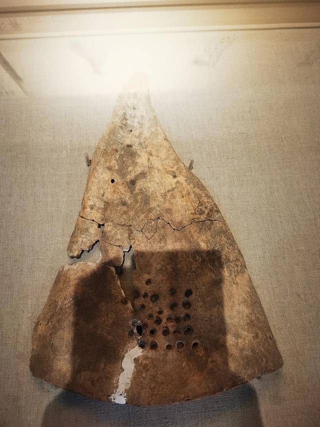 无字卜骨。骨扇上的钻凿痕迹,说明这是个占卜骨