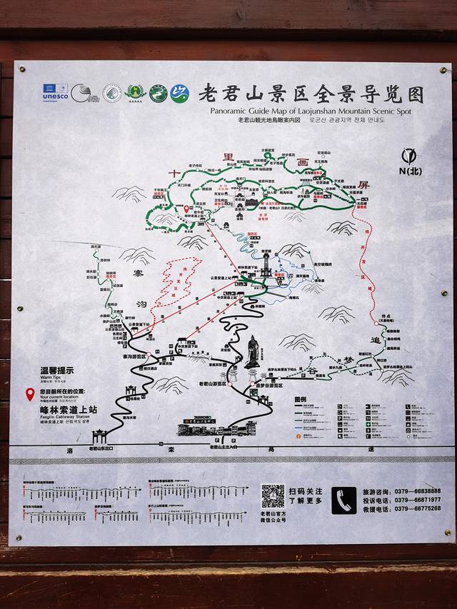 老君山有二级索道,第一级索道对一日游的人来说是必坐的,第二级索道看个人情况,体力充沛、腿脚利落的人可以不用坐索道,但要爬1668阶台阶,这段山体只有台阶没有扶手,爬山的人很多都买了登山杖。