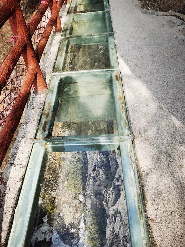 一小截玻璃栈道。在舍身崖那里有个大型玻璃栈道,收费的