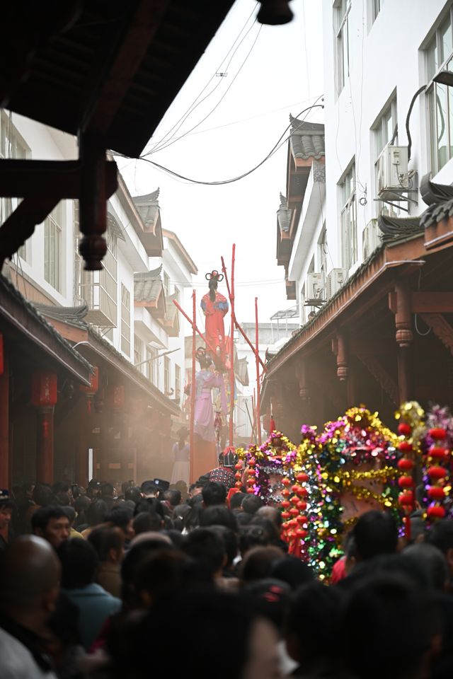 不只是铁桩戏,巡游队伍里还能看到很多其他特色表演,建武秧歌、建武祥龙、船船灯…所到之处,都会引来阵阵欢呼,节日的氛围可算是被九丝文昌会稳稳拿捏住了!