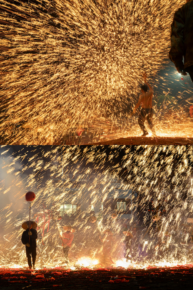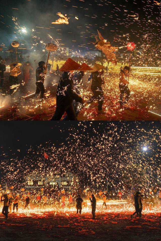 打铁花的匠人们则分布在广场两侧,将炽热的铁水击打至高空,瞬间绽放成千万朵铁花,独属中国人的1600度极致浪漫这一刻真的具象化了!!