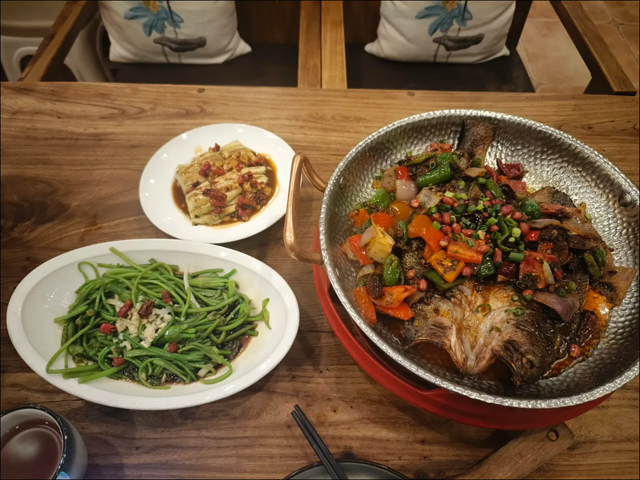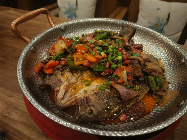 口味: 点招牌小锅饭 点炝板水性杨花 很好吃没吃过的可以试一下,口感类似秋葵空心菜的结合一样 白凉拌茄子味道还可以,个人有点吃不习惯,因为太凉了,豉香辣味的东巴烤鱼很香值得表扬!