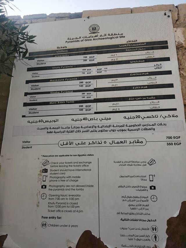 吉萨金字塔 700 EGP 免费(6岁以下) 骆驼骑行300 EGP/30分钟;马车1000埃磅/2H