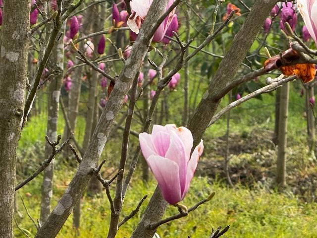 三月胭脂坝,玉兰已缀满枝头,如雪似霞的玉兰与其他正值花期的缤纷颜色交织,构成一幅流动的春景图。漫步花海中,姹紫嫣红遍,皆随风翻涌,随手一拍都是诗经里的“桃之夭夭”。