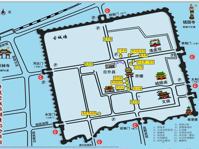 (早上去县衙看一场升堂断案表演,然后从迎薰门入口登城墙,站在城墙上俯瞰明清街全景,最后从云路风情街出口下城墙,沿街步行几分钟到文庙跨“ 龙门 坊”,去城隍庙欣赏三庙合一的建筑,下午去古城外的双林寺和镇国寺看彩塑)