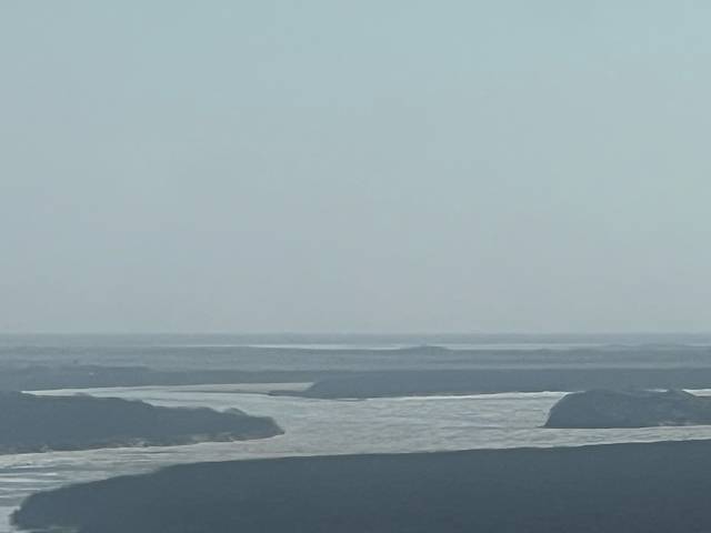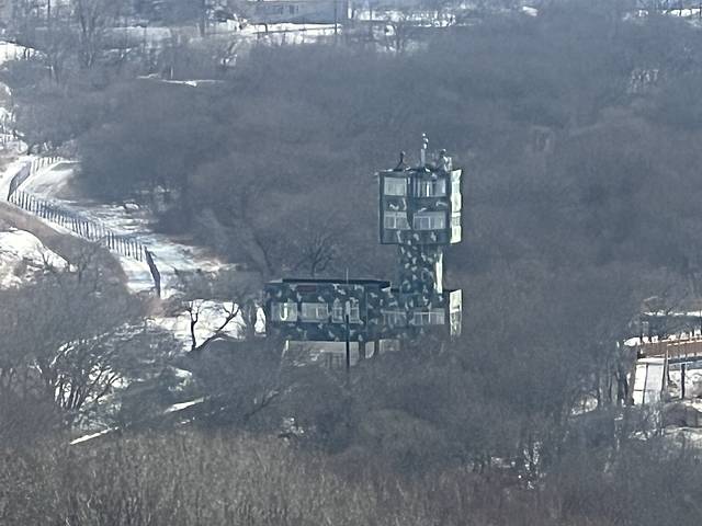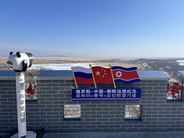 需要将私家车停在景区停车场,购买每人70元的摆渡车票,满员即走,到达一眼望三国的主楼龙虎阁。主楼共13层,可乘电梯直达11层和12层,这两层是室内观景台。步行下楼到10层为漏天平台,也是观景体验最好的场所。左手边是俄罗斯,右手边是朝鲜,正前方天际线处的海岸线就是近在咫尺的日本海,距离我们只有10多公里。