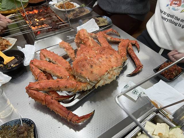 我们在帝王蟹海鲜市场买了一只5斤的大蟹,单价180元,感觉比在沈阳便宜很多了。然后找了一家开了30多年的珲春大串烧烤店,只给了5元的加工费,店家就给蒸好了,很合适。另外珲春大串也名不虚传,肉串很大,是自己动手烤的那种,吃起来非常过瘾。
