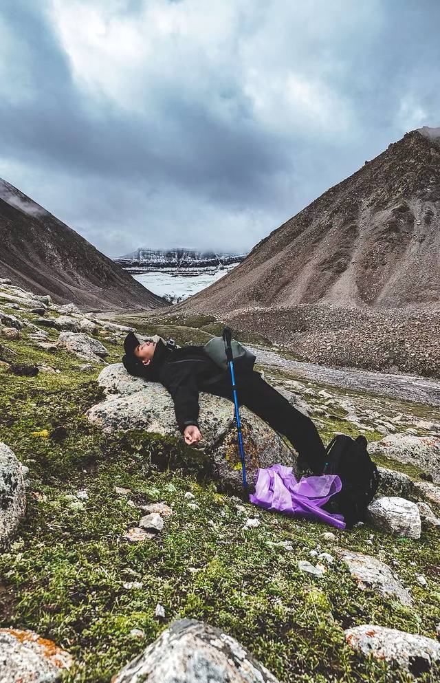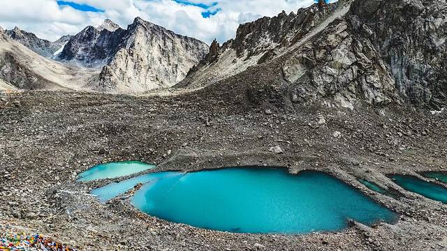翻越卓玛拉山口的时刻成为终身烙印。5630米的死亡垭口上,狂风卷着经幡抽打脸颊,五色隆达在铅灰色云层下纷飞如蝶。我跪在经幡堆旁,从背包扯出在塔尔钦买的经幡,冻僵的手指艰难地系着绳结。蓝幡代表天空,白幡是云朵,红幡如火焰,在呼啸的风雪中猎猎翻卷,仿佛要将祈愿直接送上苍穹。撒隆达时,纸片刚离手便被狂风倒卷回来,黏在湿透的冲锋衣上,像神山赐予的彩色鳞片。